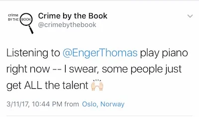 I've been looking forward to this concert for quite a while now—you guys know how much I love Thomas Enger's Henning Juul series, and it was truly such a cool thing to get to listen to his music, too. He's an incredibly talented pianist - if you have a moment, check out our interview (linked below) and listen to the song he performed at the concert. My reaction to this concert on Twitter pretty much sums it up...